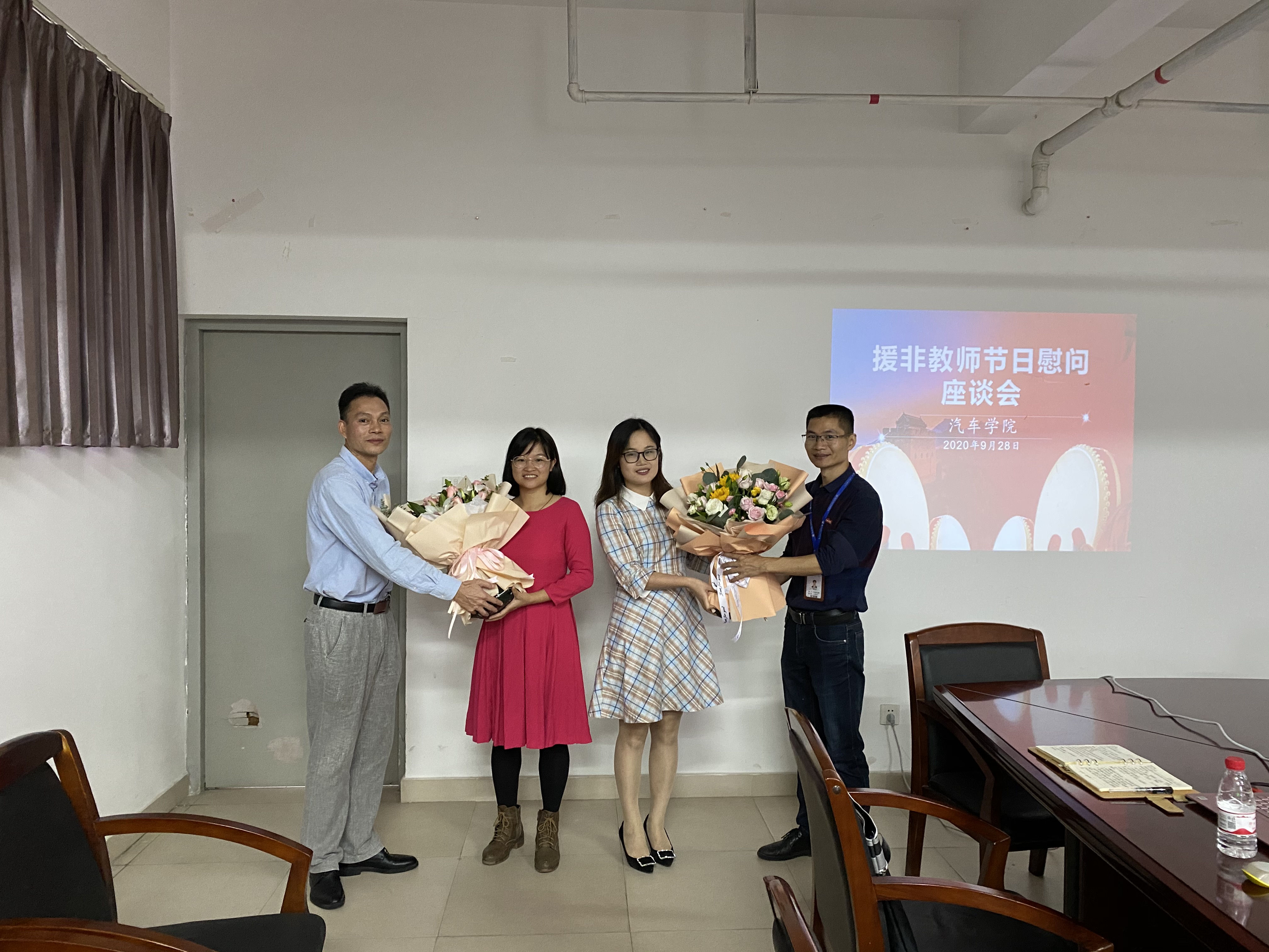 2020年9月28日,學(xué)校工會(huì)、教師工作部、對(duì)外交流中心和汽車學(xué)院等部門聯(lián)合對(duì)我校四位援非教師進(jìn)行節(jié)日慰問(wèn),在汽車學(xué)院會(huì)議室召開(kāi)了“援非教師節(jié)日慰問(wèn)座談會(huì)”。參加座談會(huì)的有各部門代表及援非教師家屬代表,參會(huì)代表非常關(guān)心朱劍寶、葉陳勇、杜盼成、吳庚等在非洲工作的老師家屬的工作、生活、孩子上學(xué)等方面的情況,大家都表示:學(xué)校是援非教師們的堅(jiān)強(qiáng)后盾,相關(guān)部門會(huì)做好各項(xiàng)服務(wù)工作,解決教師們實(shí)際困難,為他們解決后顧之憂,讓他們能夠安心的在外工作。對(duì)家屬們的理解和支持表示衷心的感謝!