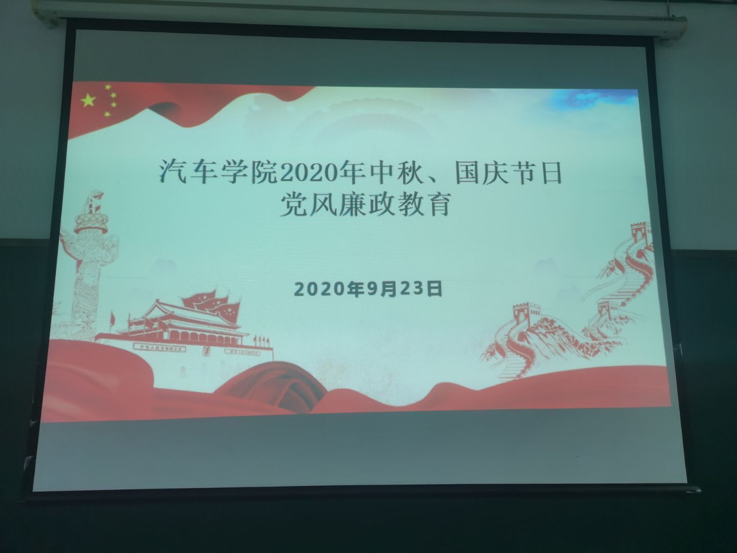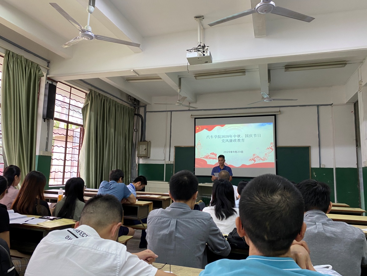 為深入貫徹落實中央八項規(guī)定精神及實施細(xì)則精神和我省實施辦法,汽車學(xué)院黨總支于2020年9月23日下午,在10號樓104教室開展2020年中秋國慶期間黨風(fēng)廉政教育活動。蔡華錦書記傳達(dá)學(xué)院紀(jì)委關(guān)于做好兩節(jié)期間黨風(fēng)廉政工作的通知要求,強(qiáng)調(diào)黨組織要落實全面從嚴(yán)治黨主體責(zé)任清單,主動壓緊壓實主體責(zé)任,嚴(yán)格落實中央八項規(guī)定及實施細(xì)則精神和我省實施辦法,嚴(yán)守紀(jì)律要求,確保廉潔過節(jié)。