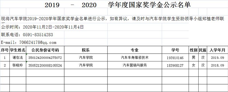 國(guó)家獎(jiǎng)學(xué)金公示表(汽車(chē)學(xué)院)