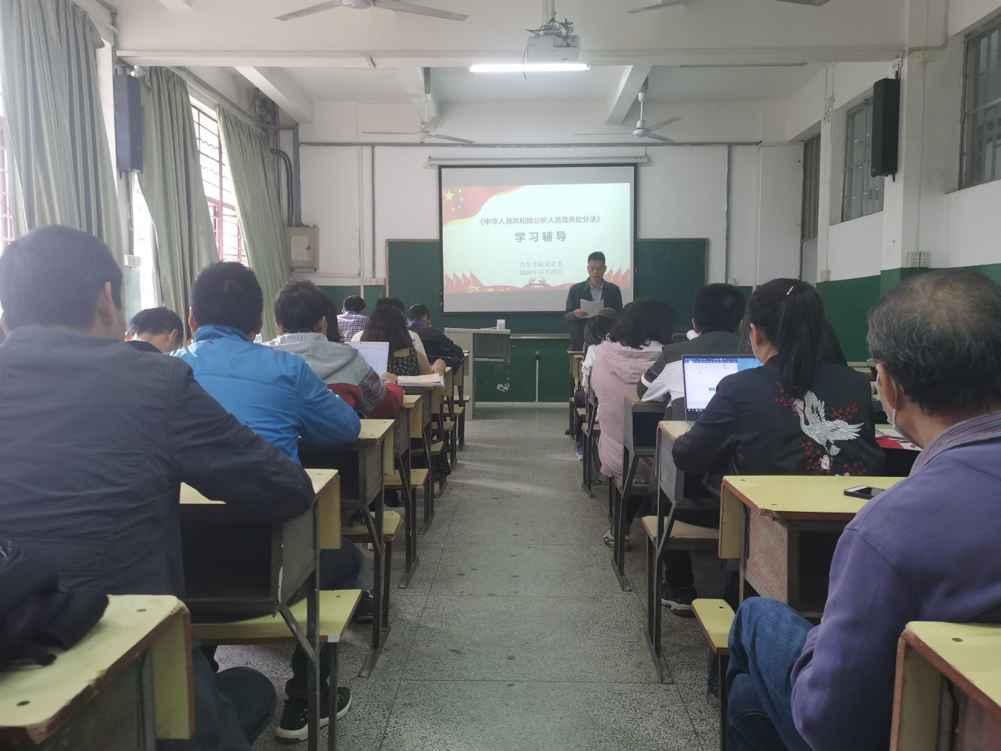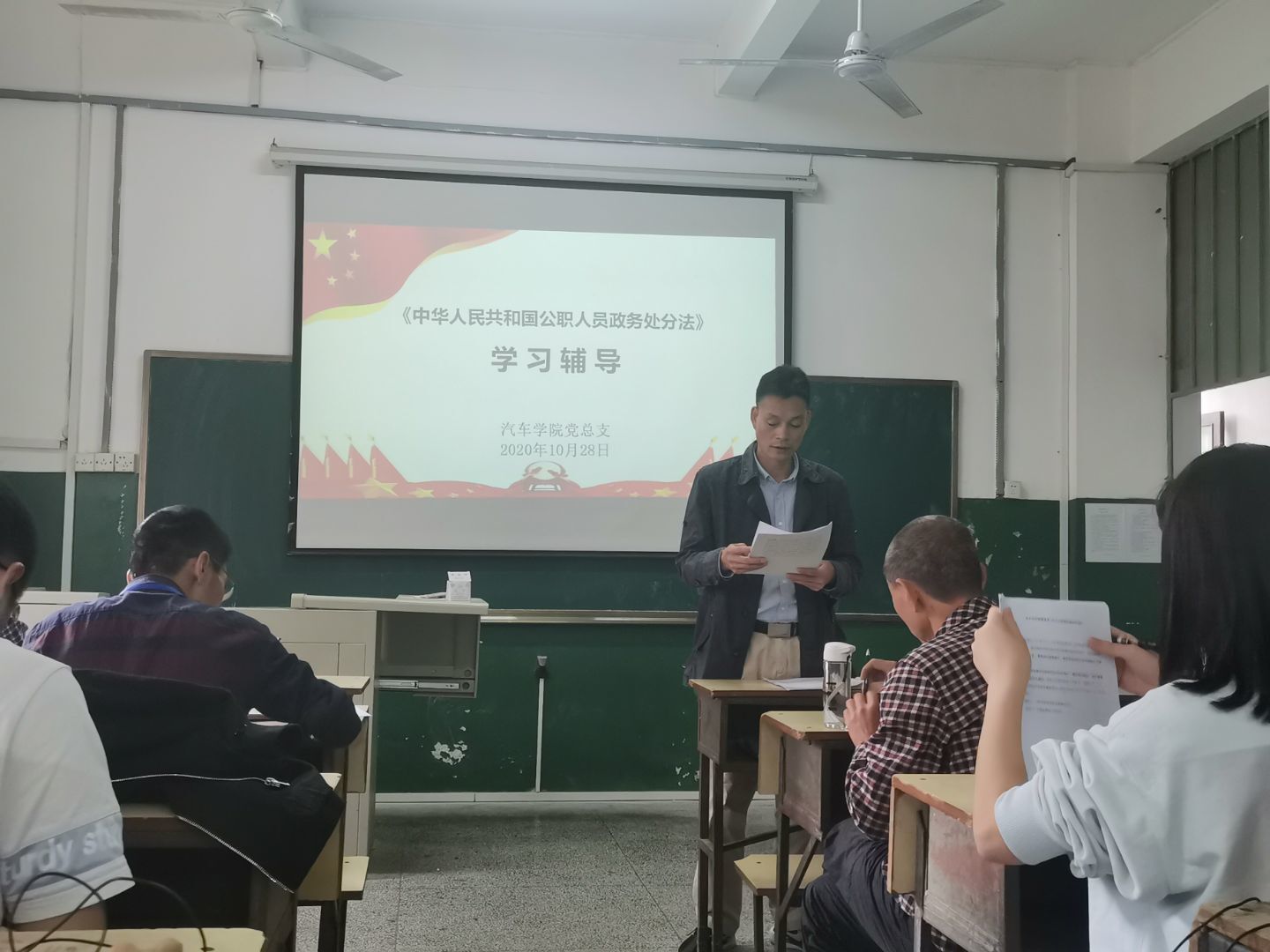 2020年10月28日下午在10號(hào)樓104教室,汽車學(xué)院全體教職工開展《政務(wù)處分法》學(xué)習(xí)會(huì)。
