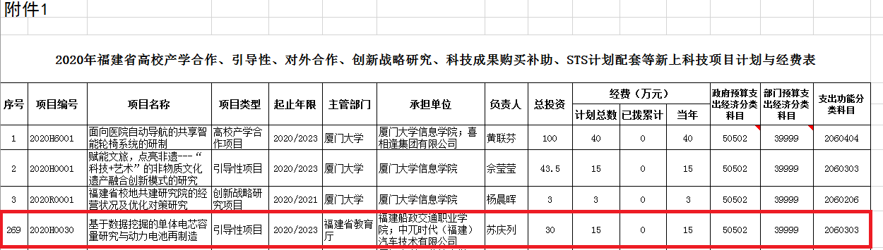 11月17日,福建省財政廳、福建省科學(xué)技術(shù)廳公布2020年度科技計劃項目評審結(jié)果,我院汽車科技創(chuàng)新服務(wù)團(tuán)隊負(fù)責(zé)人蘇慶列副教授主持的《基于數(shù)據(jù)挖掘的單體電芯容量研究與動力電池再制造》項目,喜獲福建省科技廳引導(dǎo)性重點項目資助,經(jīng)費(fèi)15萬元。