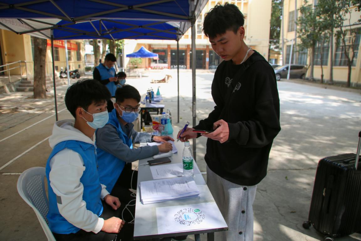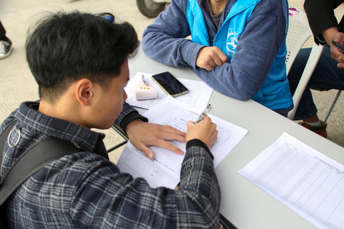 報(bào)道點(diǎn)志愿者對返校學(xué)生進(jìn)行登記,并進(jìn)行體溫監(jiān)測登記以及收集同學(xué)們上交的《健康承諾書》。