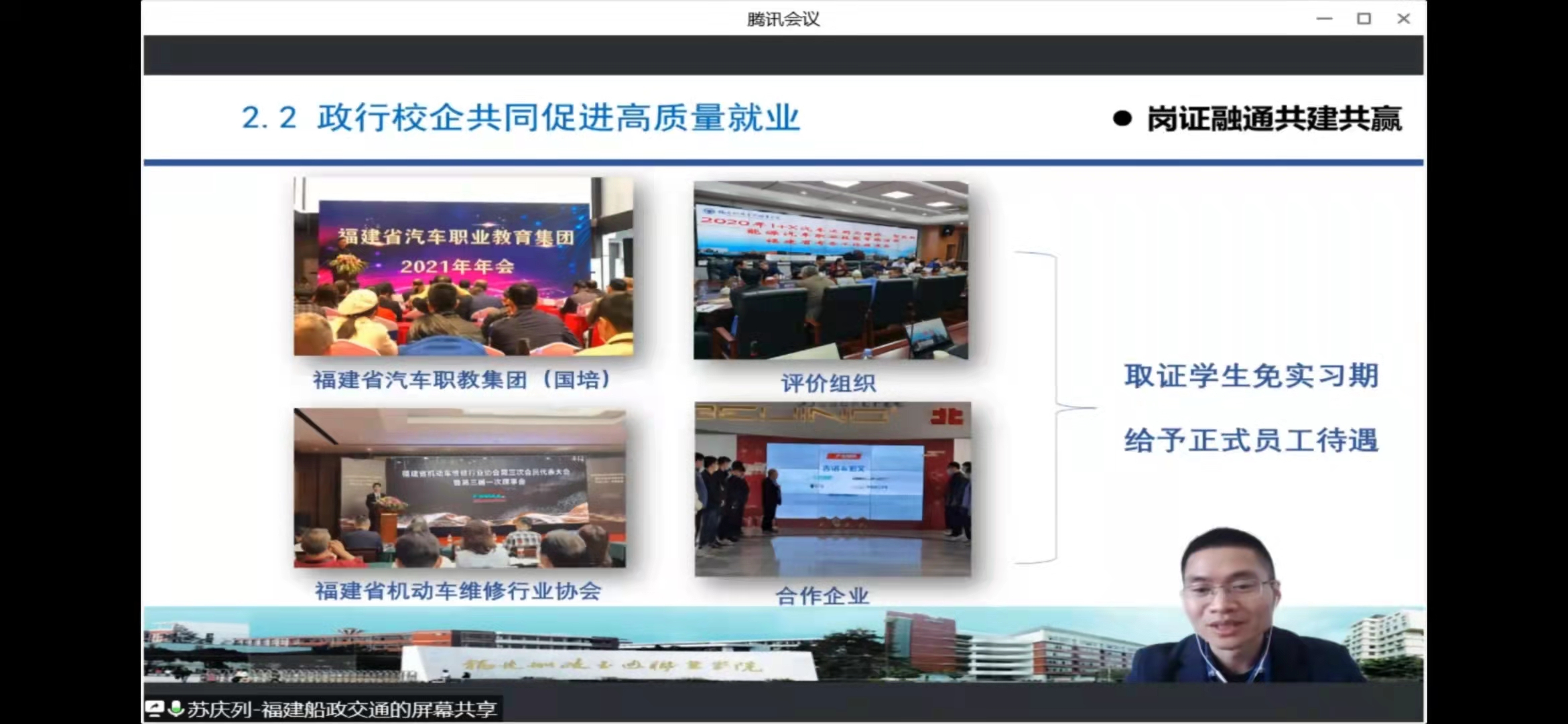 汽車學(xué)院蘇慶列院長(zhǎng)受邀在會(huì)上作“崗證融通基地建設(shè)設(shè)想”的報(bào)告,分享了汽車學(xué)院對(duì)接1+X職業(yè)證書制度,將崗證融通融入教學(xué),研修人才培養(yǎng)方案、重構(gòu)課程教學(xué)標(biāo)準(zhǔn)、實(shí)施模塊化教學(xué)等教學(xué)改革,從校企合作共建崗證融通實(shí)訓(xùn)基地、政行校企共同促進(jìn)高質(zhì)量就業(yè)、崗證融通基地助力1+X證書推廣三個(gè)維度提出了崗證融通共建共贏的設(shè)想,報(bào)告獲得與會(huì)代表的熱烈好評(píng)。