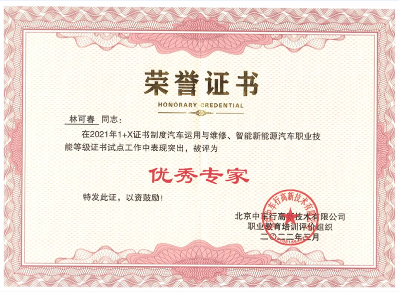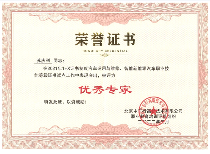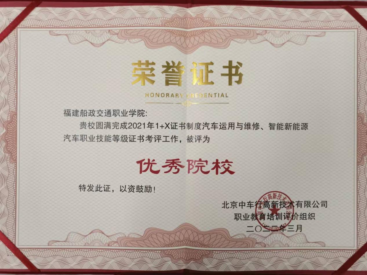 2021年,汽車學院順利完成了汽車運用與維修“1+X”證書考點建設(shè)和學生考證工作,在培訓考評工作過程中,由于表現(xiàn)突出,被教育部評價組織北京中車行高新技術(shù)有限公司授予考評工作“優(yōu)秀院?!狈Q號,汽車學院蘇慶列院長、林可春副院長被評為“優(yōu)秀專家”。
