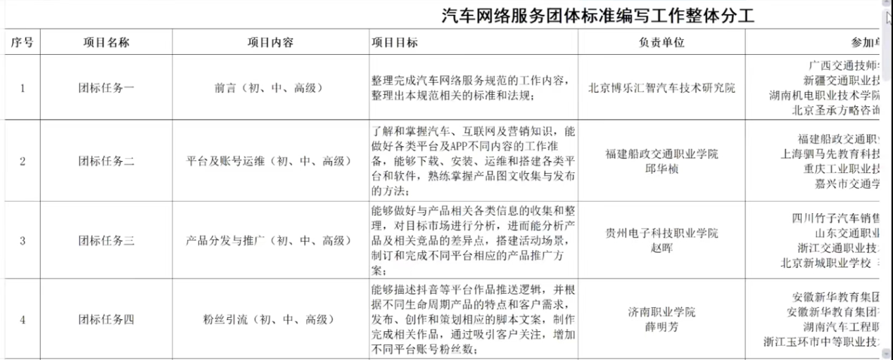 表1《汽車網(wǎng)絡(luò)服務(wù)職業(yè)能力評價(jià)規(guī)范》團(tuán)體標(biāo)準(zhǔn)編寫分工