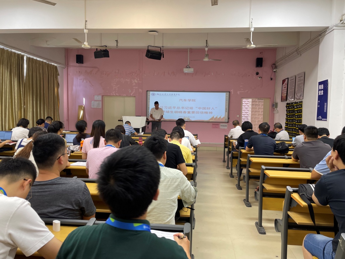 9月21日,汽車學(xué)院黨總支傳達學(xué)習習近平總書記給“中國好人”李培生、胡曉春重要回信精神,全體教職工參加學(xué)習。