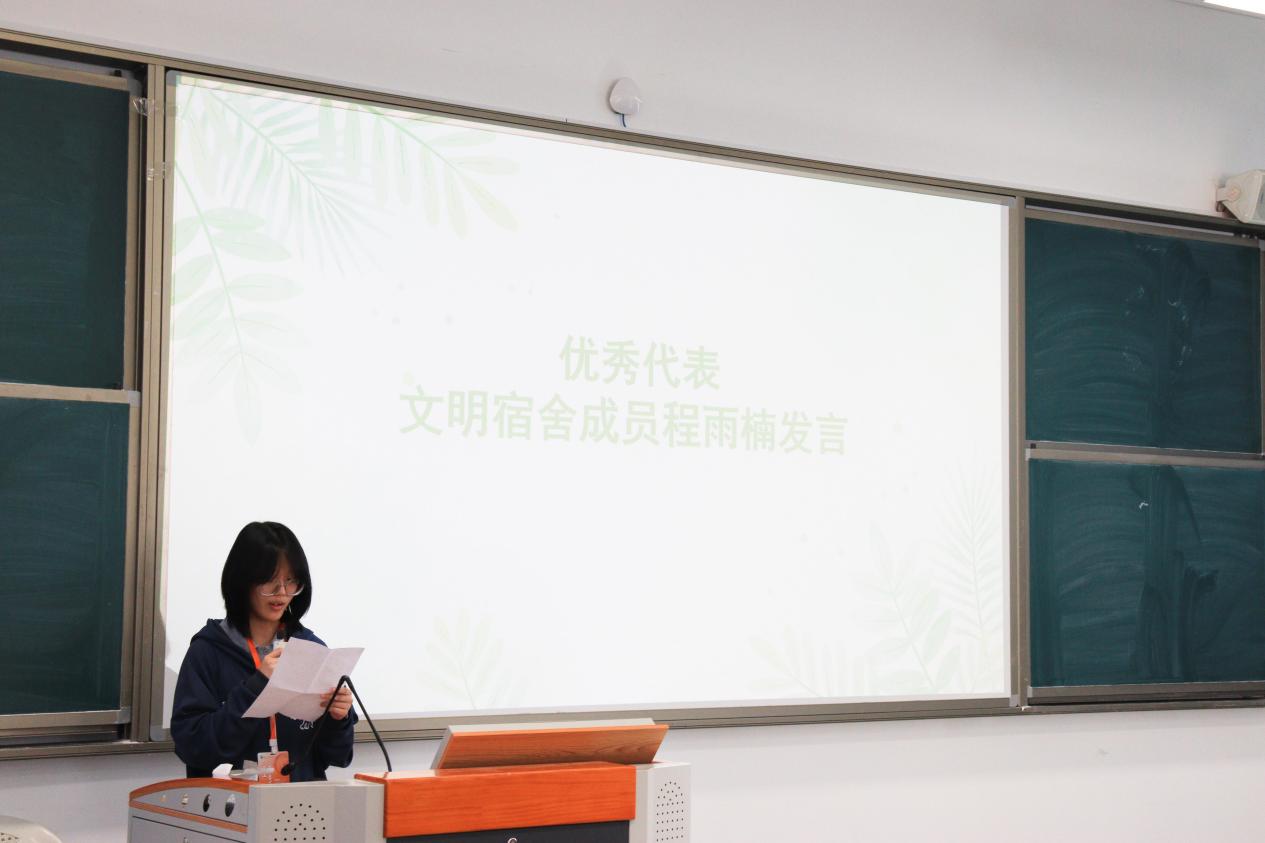 在交流分享環(huán)節(jié),獲獎(jiǎng)宿舍代表程雨楠結(jié)合日常管理經(jīng)驗(yàn),從衛(wèi)生維護(hù)、安全值守、學(xué)風(fēng)共建、團(tuán)隊(duì)協(xié)作等方面展開(kāi)分享。在她看來(lái),文明宿舍的建設(shè)離不開(kāi)“分工明確、互相包容”的相處之道,更得益于“勤學(xué)互助、共同進(jìn)步”的良好氛圍,小小的宿舍不僅是生活居所,更是錘煉品德、共同成長(zhǎng)的“第二課堂”。