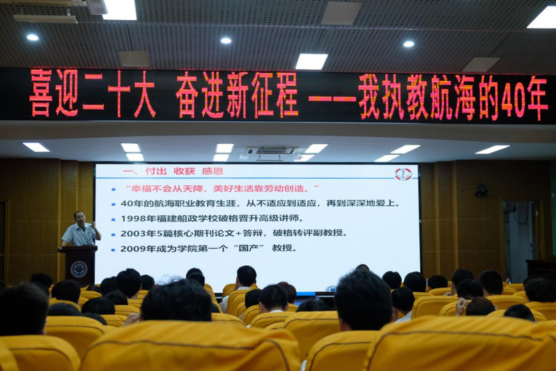 陳宏教授從自身航海執(zhí)教生涯的親身經(jīng)歷出發(fā),表達了對學(xué)校40年如一日的深厚感情,講述了他即便罹患癌癥也不離不棄的堅守,呼吁廣大師生在平凡的崗位中用忍耐的心包容、用真誠的心待人、用堅毅的心攻堅,做到對工作有熱愛、心中有責(zé)任,用青春書寫新時代的風(fēng)采。