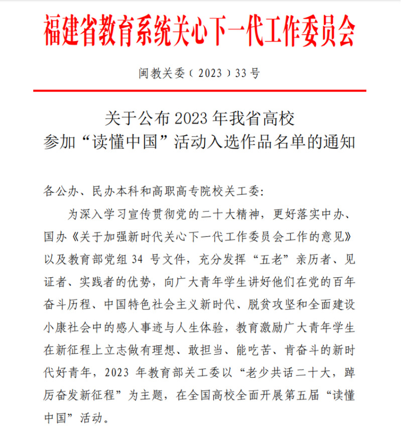 日前,福建省教育系統(tǒng)關(guān)工委公布了2023年我省高校參加“讀懂中國”活動入選作品名單,我院關(guān)工委榮獲全省優(yōu)秀組織獎,微視頻《“船”承人》成功入選全省最佳“讀懂中國”微視頻作品,《學(xué)習(xí)貫徹二十大,紅色校史砥礪行》榮獲全省優(yōu)秀“讀懂中國”微視頻作品,2篇學(xué)生征文入選全省優(yōu)秀征文作品。