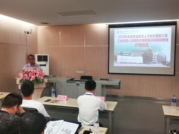 楊開懷院長首先對參加開班儀式的領導和嘉賓表示歡迎,對給予此次培訓技術支持的福建閩大科技有限公司表示感謝。接著介紹了機械與智能制造學院工業(yè)機器人專業(yè)的歷史沿革,以及工業(yè)機器人應用技術領域近年來的發(fā)展前景,我院在工業(yè)機器人專業(yè)課程優(yōu)化、實驗室建設、技能競賽等方面取得的優(yōu)異成績,并努力致力于為我省乃至全國的工業(yè)機器人行業(yè)培養(yǎng)高素質(zhì)技能人才。