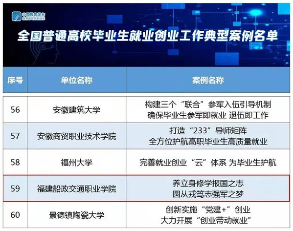 2021年11月26日,教育部發(fā)布公告,公布了100個全國普通高校畢業(yè)生就業(yè)創(chuàng)業(yè)工作典型案例,我院《養(yǎng)立身修學(xué)報國之志 圓從戎篤志強軍之夢》案例成功入選,成為福建省唯一入選的高職院校。