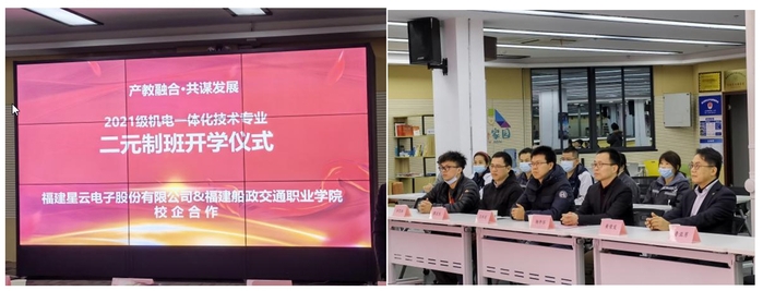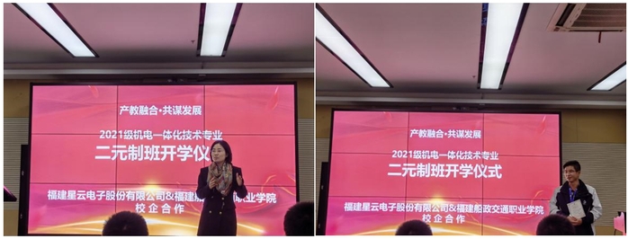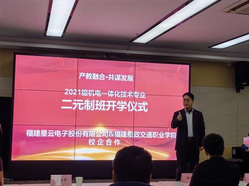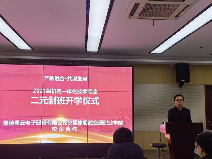 2022年1月13日,福建船政交通職業(yè)學院機械與智能制造學院2021級機電一體化技術專業(yè)“二元制”班級開學儀式在福建星云電子股份有限公司隆重舉行。福建星云電子股份有限公司首席運營官黃榮發(fā)先生,人力資源總監(jiān)魯亞男女士,機械與智能制造學院楊開懷院長,王水發(fā)副院長等校企工作人員以及“二元制”班級的所有同學共同出席典禮。