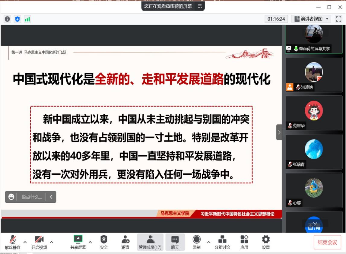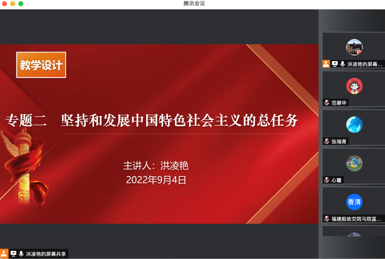 2022年9月4日,馬克思主義學(xué)院“習(xí)近平新時(shí)代中國(guó)特色社會(huì)主義思想概論”教研室全體專兼職教師在騰訊會(huì)議開展了“優(yōu)·美”教學(xué)工作坊教研活動(dòng)。本次教研的內(nèi)容是本課程的“專題二 堅(jiān)持和發(fā)展中國(guó)特色社會(huì)主義的總?cè)蝿?wù)”,由洪凌艷老師擔(dān)任主備課人。