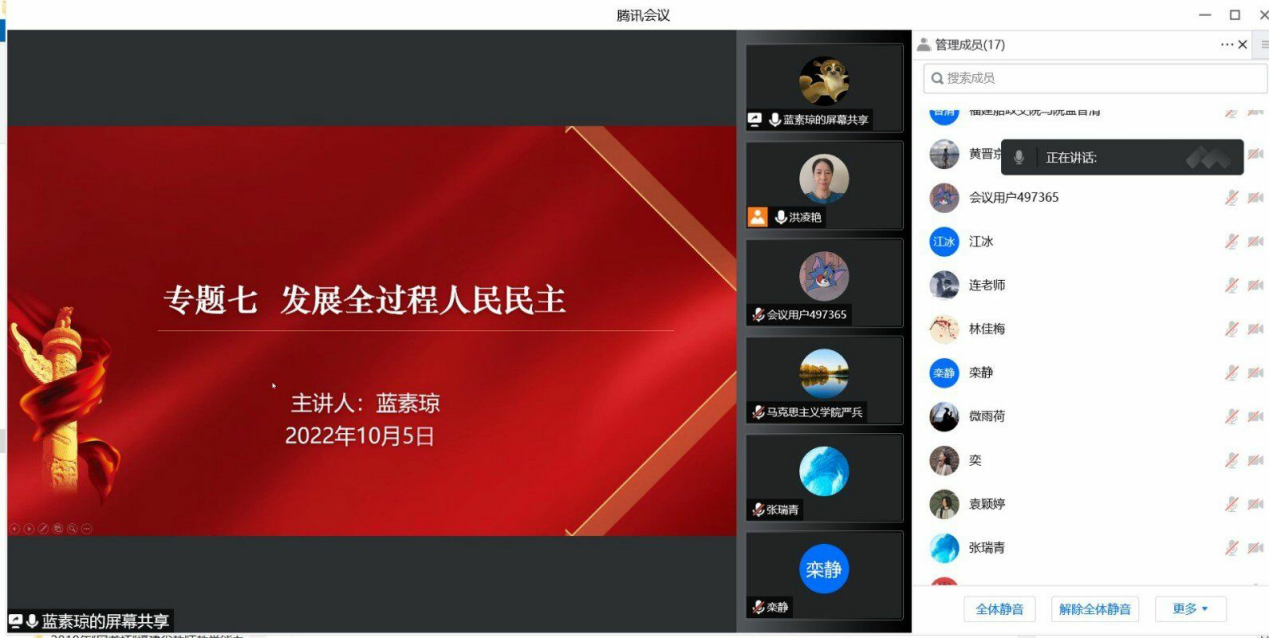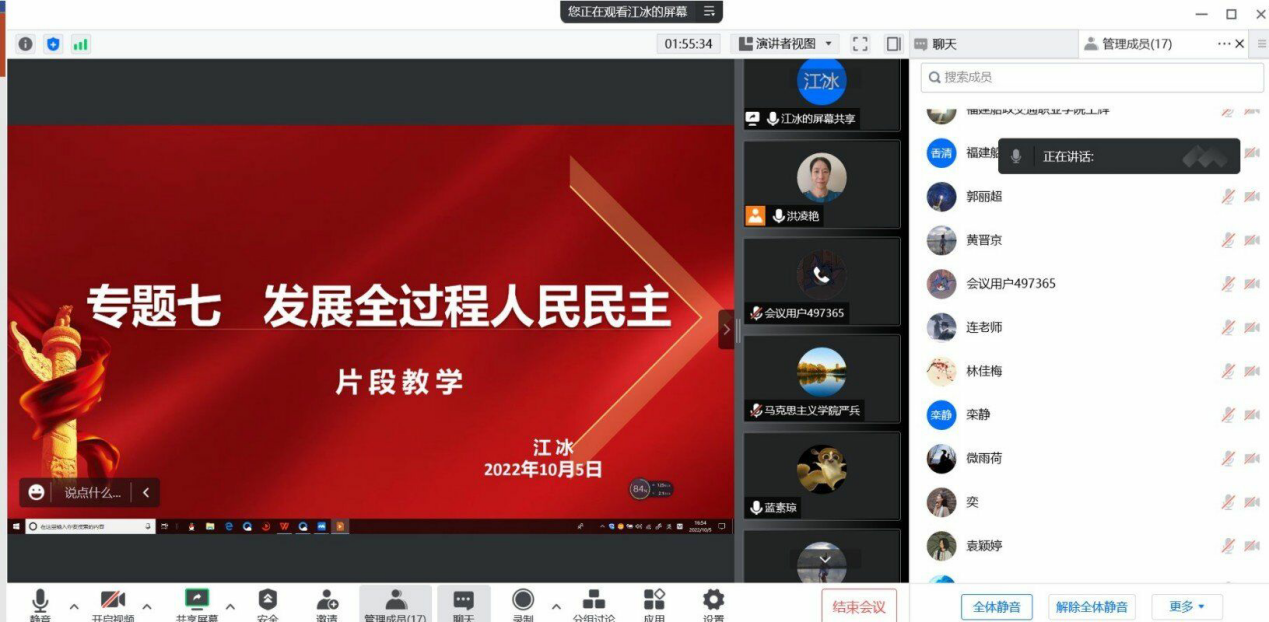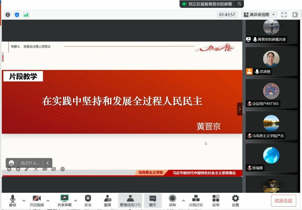 2022年10月5日馬克思主義學(xué)院習(xí)近平新時(shí)代中國特色社會主義思想概論教研室舉行了本學(xué)期第七次集體備課會,由于疫情影響,本次備課會在線上進(jìn)行。由教研室主任洪凌艷老師主持,藍(lán)素瓊老師就第七專題“全過程人民民主”進(jìn)行主講,江冰老師和黃晉京老師進(jìn)行片段教學(xué)展示,全體專兼職任課教師參加了會議。會議分為兩個(gè)階段。