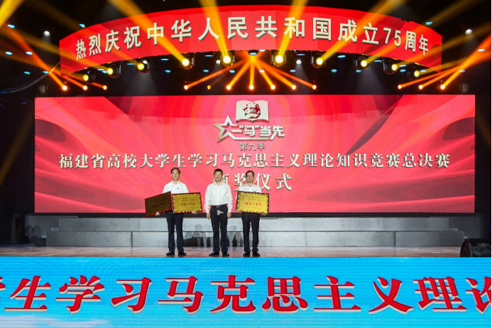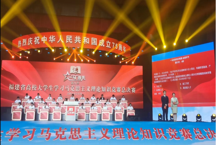 為熱烈慶祝中華人民共和國成立75周年,堅(jiān)持不懈用習(xí)近平新時(shí)代中國特色社會(huì)主義思想鑄魂育人,引導(dǎo)青年學(xué)生立報(bào)國強(qiáng)國大志向、做挺膺擔(dān)當(dāng)奮斗者,9月27日,由中共福建省委教育工委主辦,福建省高校思想政治理論課教學(xué)指導(dǎo)委員會(huì)、福建教育電視臺(tái)承辦的第九季福建省高校大學(xué)生學(xué)習(xí)馬克思主義理論“一‘馬’當(dāng)先”知識(shí)競(jìng)賽總決賽在福州大學(xué)旗山校區(qū)落下帷幕。我院黨委書記陳宜大攜師生代表參與活動(dòng)觀摩。