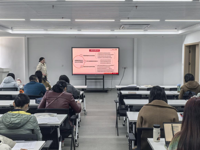 集體備課會中,藍素瓊老師圍繞“加快建設社會主義文化強國”的研討主題,從為何要建設社會主義文化強國、為何能建設社會主義文化強國、如何加快建設社會主義文化強國等三個方面進行了生動講解。在教學設計中,采用小組討論、案例分析和課堂互動相結(jié)合的方式,運用貼近學生生活的案例和前沿文化項目,將抽象理論轉(zhuǎn)化為具象案例,激發(fā)學生的學習興趣和參與熱情。