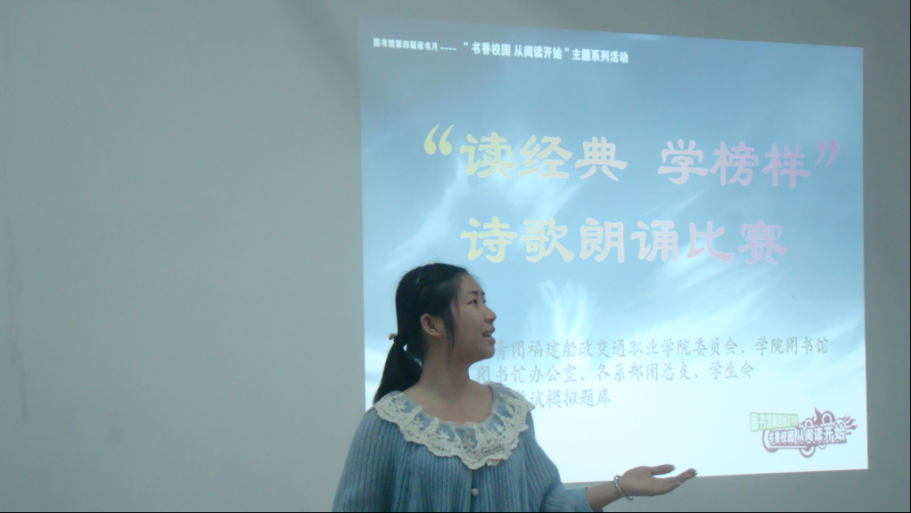 3月22日,圖書館“書香校園從閱讀開始”第四屆讀書月系列活動“讀經(jīng)典學(xué)榜樣”詩歌朗誦比賽在圖書館9樓活動室舉行。全院近30名選手報(bào)名參加了比賽。