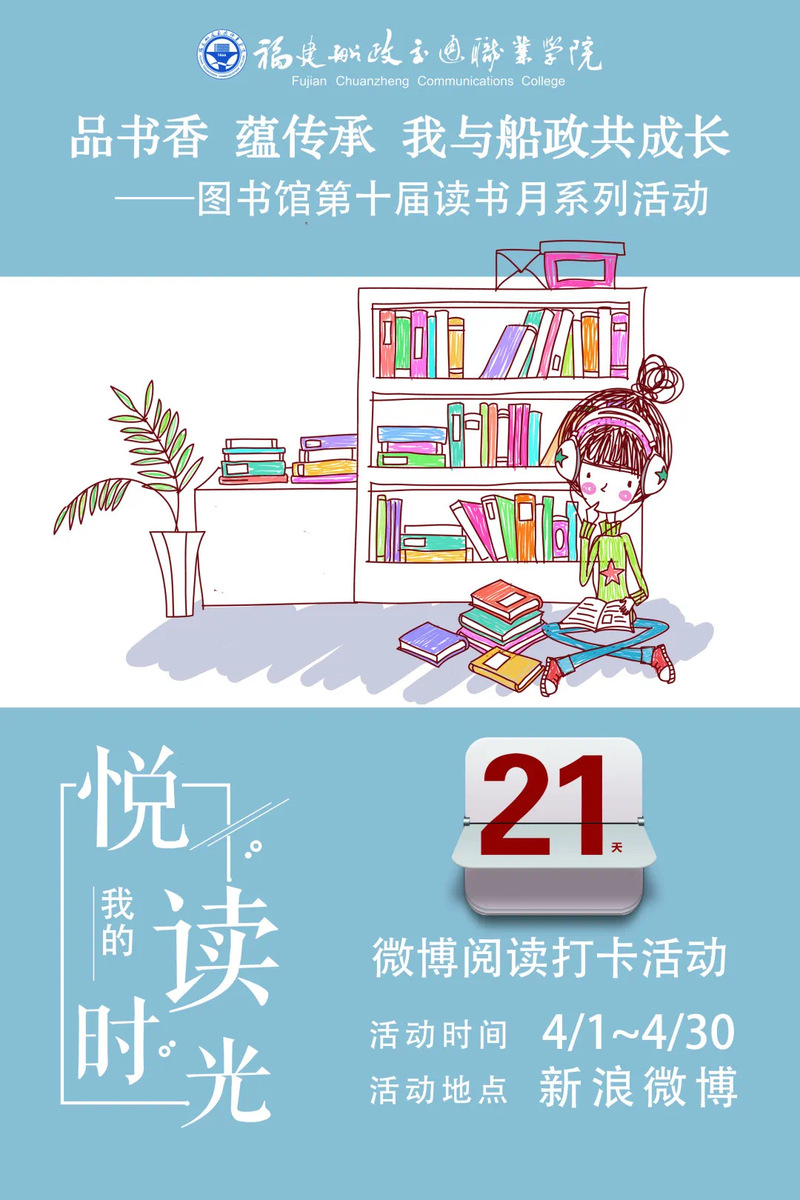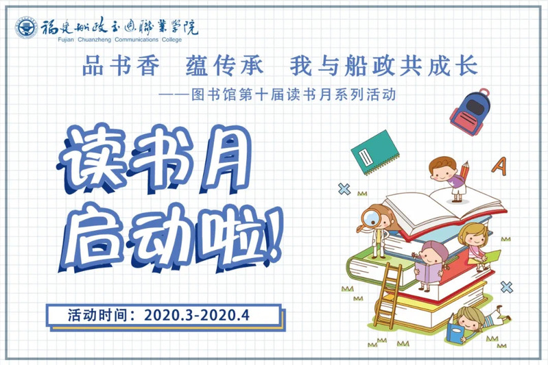 為了引導(dǎo)廣大師生養(yǎng)成多讀書、讀好書、好讀書的習(xí)慣,在第25個“世界讀書日”來臨之際,我院圖書館于2020年3月—4月開展“品書香,蘊船政,我與船政共成長”圖書館第十屆讀書月系列活動,活動包含豐富多彩、形式多樣的線上閱讀活動,同時我們也為大家準備了各種精美的禮品。希望廣大師生及時關(guān)注我館的微博、微信公眾號,歡迎大家的參與!