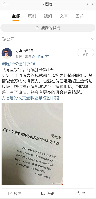 保持每日閱讀,同時記錄閱讀中使你有所感觸的內(nèi)容及感想,以文字或拍照的形式進行新浪微博打卡,注明你所閱讀的書籍名稱以及打卡天數(shù),并選擇話題留言