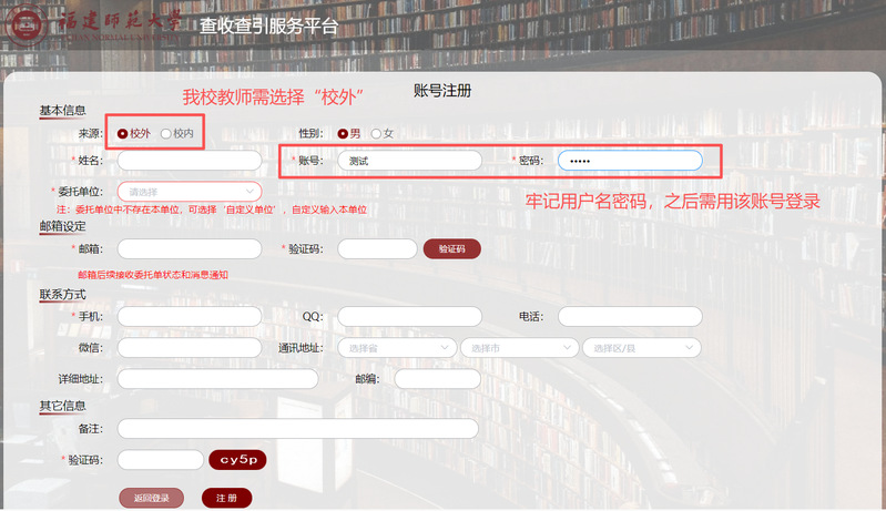 ① 注冊時“來源”請選擇“校外”,“學?!币粰谳斎搿案=ù煌殬I(yè)學院”;