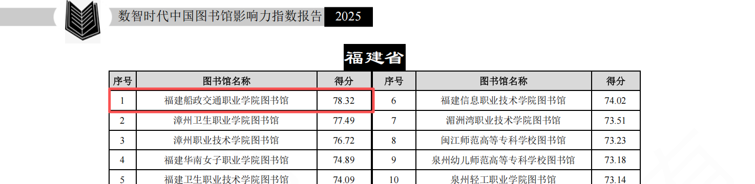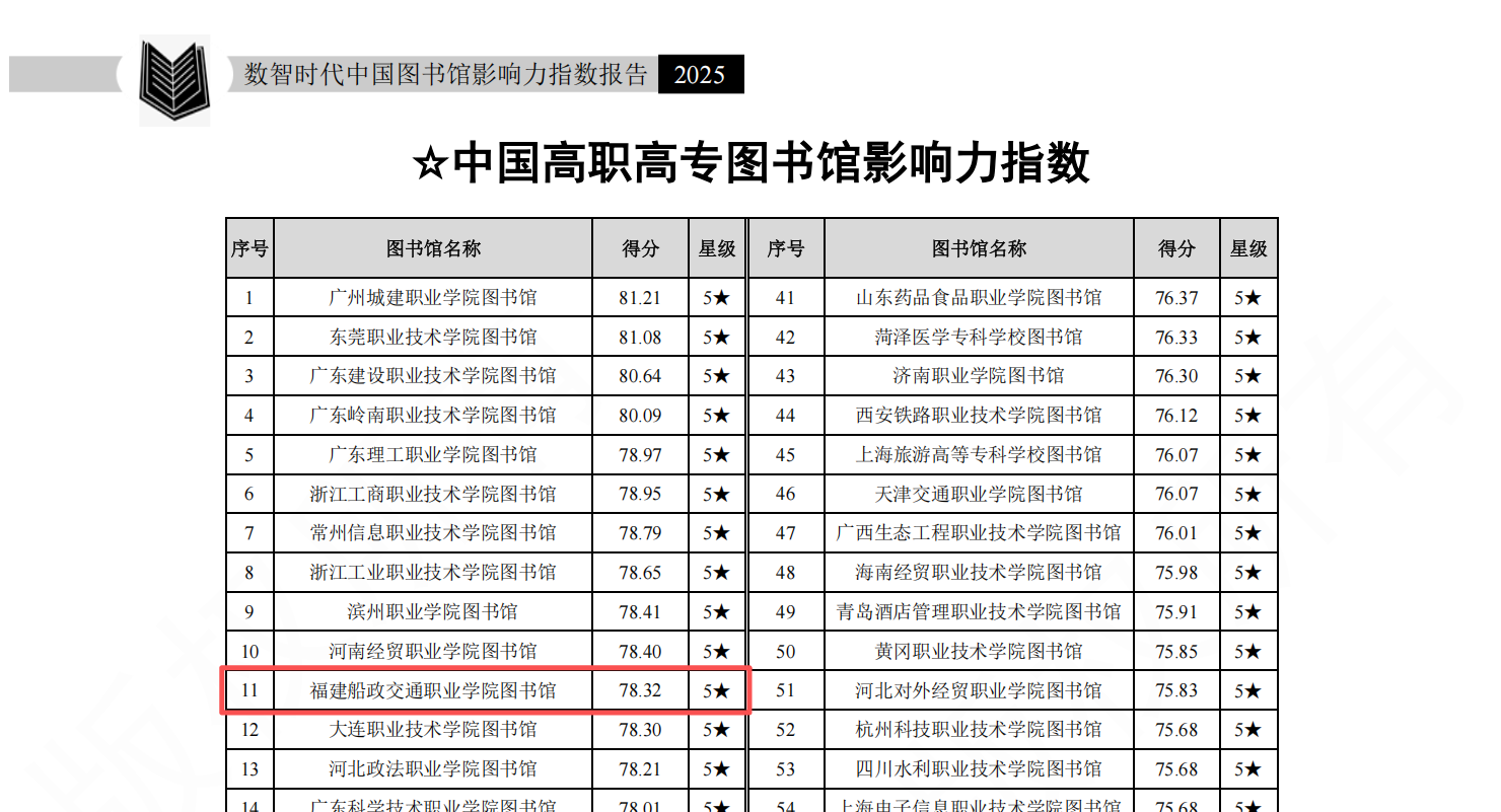 2025年12月27日,武漢大學(xué)中國(guó)科學(xué)評(píng)價(jià)研究中心、數(shù)字出版智能服務(wù)技術(shù)教育部工程研究中心研究的《數(shù)智時(shí)代中國(guó)圖書館影響力指數(shù)報(bào)告(2025版)》正式發(fā)布。該報(bào)告對(duì)我國(guó)2919所普通高校圖書館(含1275所本科院校圖書館及1545所高職(專科)院校圖書館)、1980家公共圖書館和390家專業(yè)圖書館進(jìn)行評(píng)價(jià)(不含港澳臺(tái)地區(qū)圖書館),并從多維度產(chǎn)生多個(gè)排行榜。福建船政交通職業(yè)學(xué)院圖書館在2025年“中國(guó)高職高專圖書館影響力總排行榜”中,位列全國(guó)高職高專院校第11位、福建省高職高專院校第1位。
