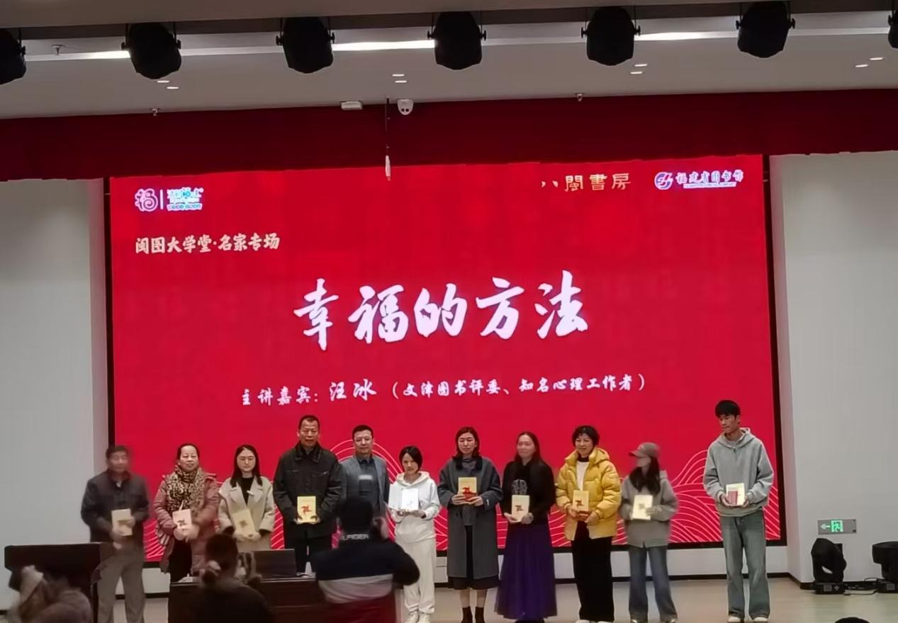 活動現(xiàn)場志愿者擔(dān)任會場引導(dǎo)員,保障講座秩序井然,并聆聽了閩圖大學(xué)堂·名家舉辦的《幸福的方法》講座。講座中,專家從積極心理學(xué)視角出發(fā),生動闡述幸福的內(nèi)涵與實踐途徑。互動環(huán)節(jié)氣氛熱烈,兩位幸運同學(xué)在抽獎中獲得贈書。大家紛紛表示,這場講座不僅啟發(fā)了他們對個人幸福的思考,更讓他們深刻體會到,在奉獻社會、服務(wù)他人的實踐中,自身所獲得的成長與滿足感,正是幸福的重要源泉。