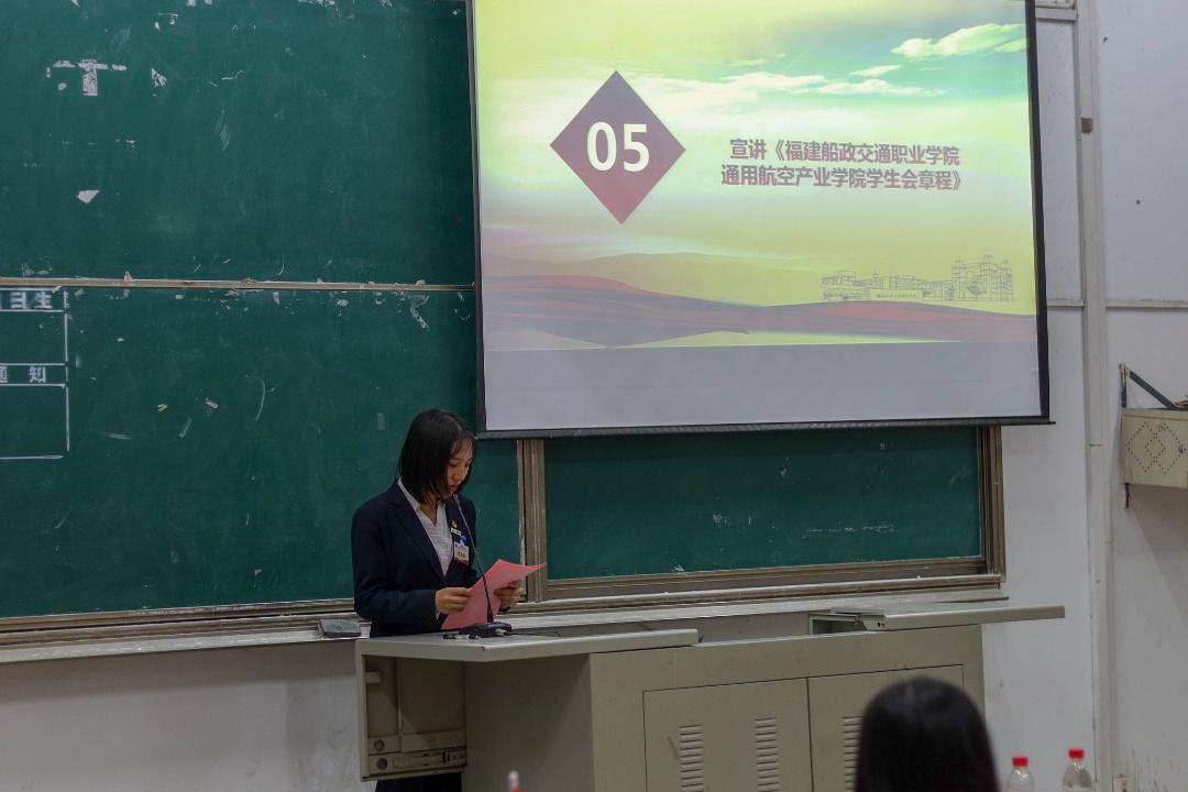 潘靜茹同學(xué)宣讀《福建船政交通職業(yè)學(xué)院通用航空產(chǎn)業(yè)學(xué)院學(xué)生會章程》(修訂案)