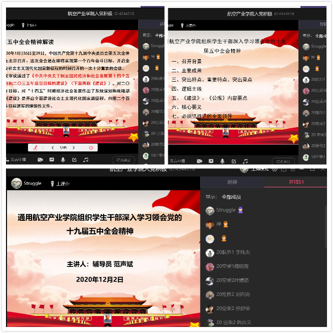 為深入學(xué)習(xí)貫徹黨的十九屆五中全會(huì)精神,切實(shí)將思想與行動(dòng)統(tǒng)一到十九屆五中全會(huì)精神上來,以實(shí)際行動(dòng)迎接建黨100周年。12月2日,通用航空產(chǎn)業(yè)學(xué)院輔導(dǎo)員范聲斌,依托QQ平臺(tái)線上+線下模式為全院學(xué)生干部、入黨積極分子解讀十九屆五中全會(huì)精神。