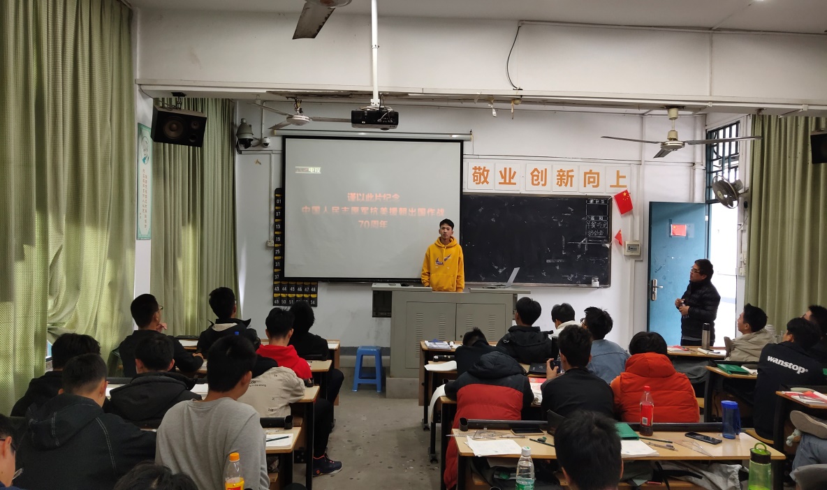 為深入貫徹落實習近平總書記在紀念中國人民志愿軍抗美援朝出國作戰(zhàn)70周年大會上的重要講話精神,深入開展“四史”學習教育,大力弘揚偉大的抗美援朝精神,加強新時代愛國主義教育,教育引導廣大學生厚植愛國主義情懷。12月5日,輔導員范聲斌于8號樓階梯教室,召開主題班會介紹革命傳統(tǒng)、講述英雄事跡、分享個人對于觀看《為了和平》感受,要求學生要銘記抗美援朝戰(zhàn)爭的艱辛歷程和偉大勝利,緬懷先烈的英勇事跡,更要學習前輩的崇高精神,珍惜當下的和平生活,牢記使命和責任,與學生共情、共鳴、共振。