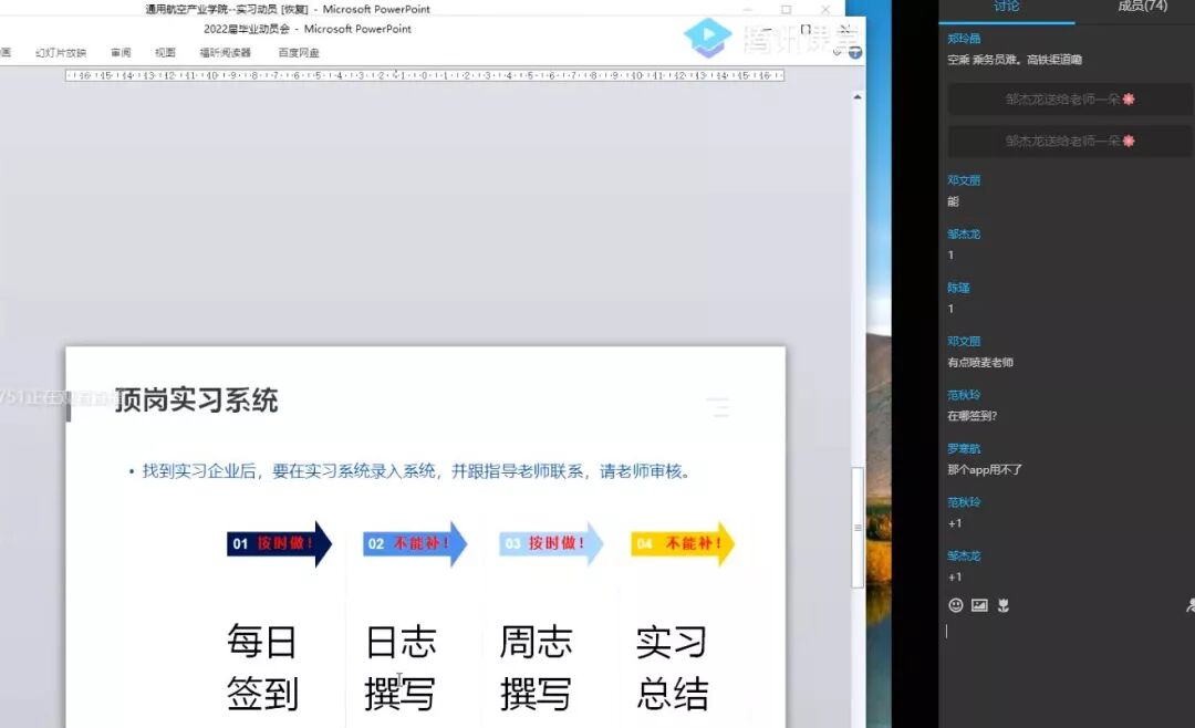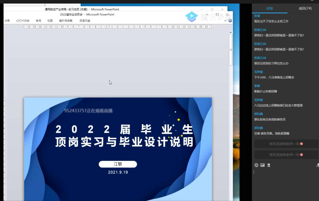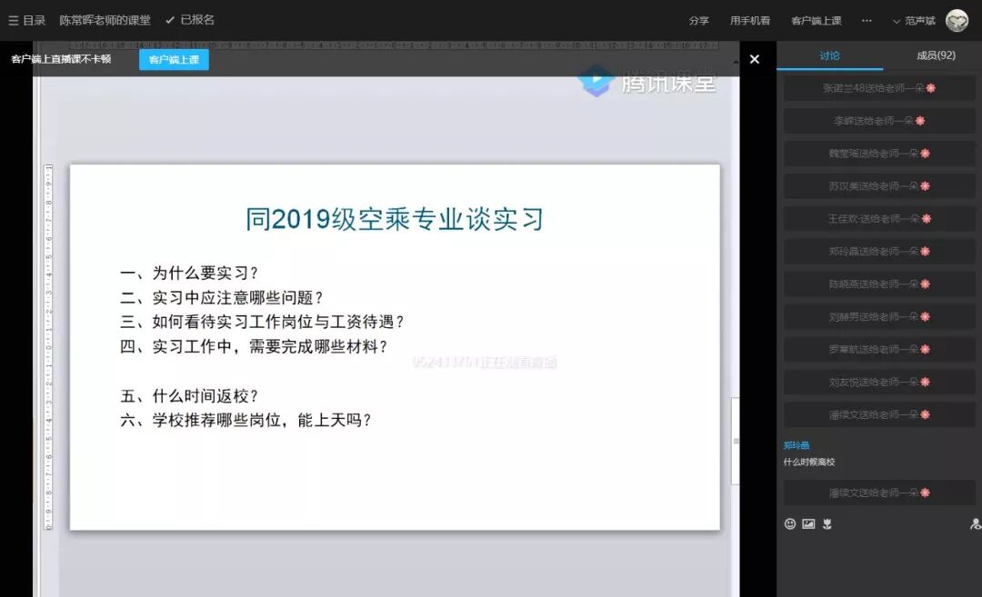 2019級(jí)空中乘務(wù)專業(yè)學(xué)生即將奔赴實(shí)習(xí)崗位,為進(jìn)一步加強(qiáng)2019級(jí)離校實(shí)習(xí)學(xué)生安全教育和管理工作,做好學(xué)生校外實(shí)習(xí)的疫情防控工作,充分保障學(xué)生實(shí)習(xí)期間的安全,強(qiáng)化學(xué)生遵紀(jì)守法觀念和安全防范意識(shí)。9月15日,通用航空產(chǎn)業(yè)學(xué)院依托騰訊平臺(tái),召開2019級(jí)學(xué)生實(shí)習(xí)動(dòng)員會(huì)暨安全教育主題班會(huì),主題班會(huì)由學(xué)院院長陳常暉主持,學(xué)院黨總支副書記蘇漢美,空乘教研室主任江敏老師、輔導(dǎo)員范聲斌老師及我院88