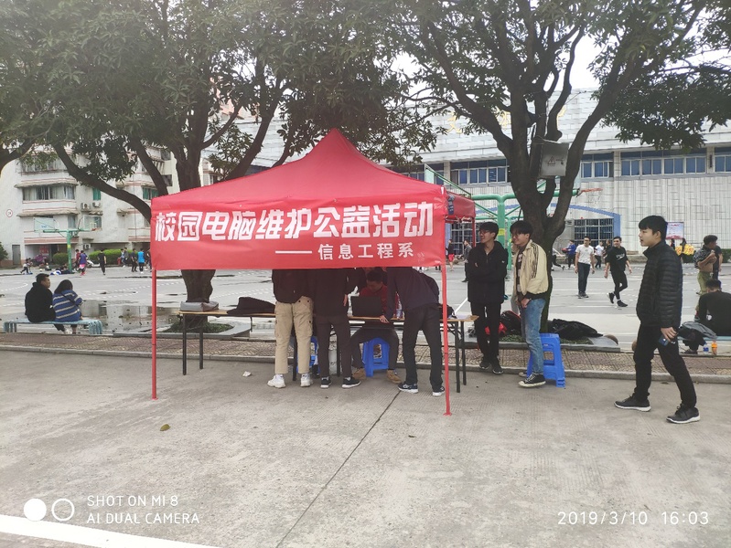 慶祝團(tuán)的十八大,我系開展放下手機(jī),走出宿舍,走向活動(dòng)校園電腦義務(wù)維護(hù)公益活動(dòng)。2019年3月10日上午,信息工程系的青年協(xié)會(huì)志愿者來到學(xué)校文化墻旁,開展本次活動(dòng),為同學(xué)及老師義務(wù)維修、維護(hù)計(jì)算機(jī),同時(shí)還為同學(xué)講解了計(jì)算機(jī)日常使用和維護(hù)的知識(shí)。