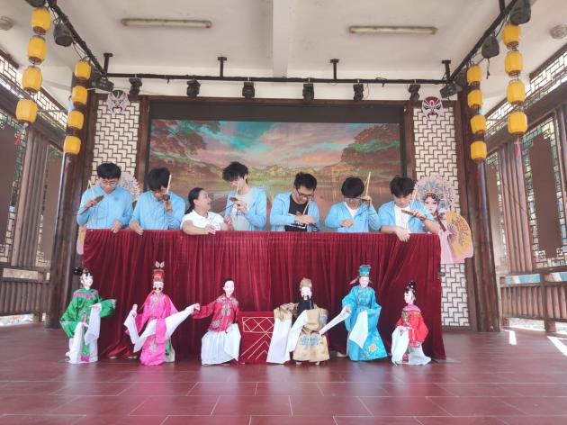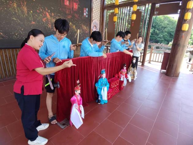 暮色之中,傳承團前往木偶戲戲臺學習提線木偶。在觀看了一場精彩的《拜壽》戲曲后,成員們躍躍欲試,開始對提線木偶技藝進行初步嘗試。細繩纏繞指尖,輕拉慢放間,木偶仿佛被注入了生命,輕輕顫動。成員們全神貫注,一絲不茍地模仿師傅的動作,盡管手法尚顯生疏,卻難掩對這門古老藝術的敬畏與熱愛。在這靜謐與靈動交織的瞬間,傳統(tǒng)技藝的種子悄然播撒心田,激發(fā)起成員們傳承與創(chuàng)新的責任感。