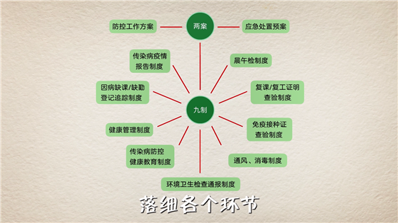 學校要完善組織領導,落實分工責任,加強校園管理,強化健康管理,校內建立四級工作網絡,校外建立聯(lián)防聯(lián)控機制,加強培訓演練,組織應急處置。實行全體師生員工健康“日報告”“零報告”制度。建立“兩案九制”,落細各個環(huán)節(jié)。