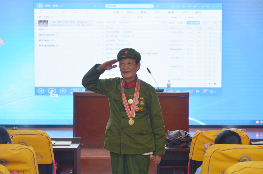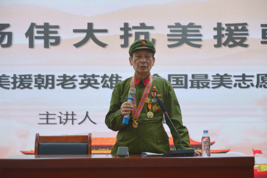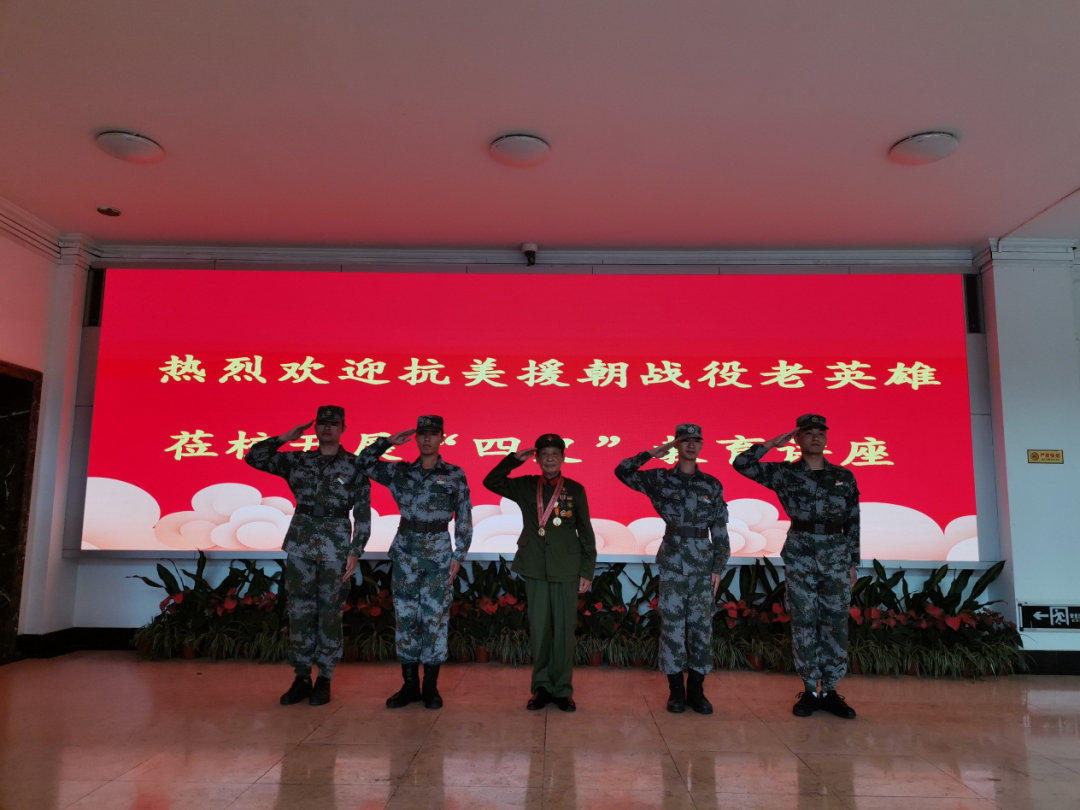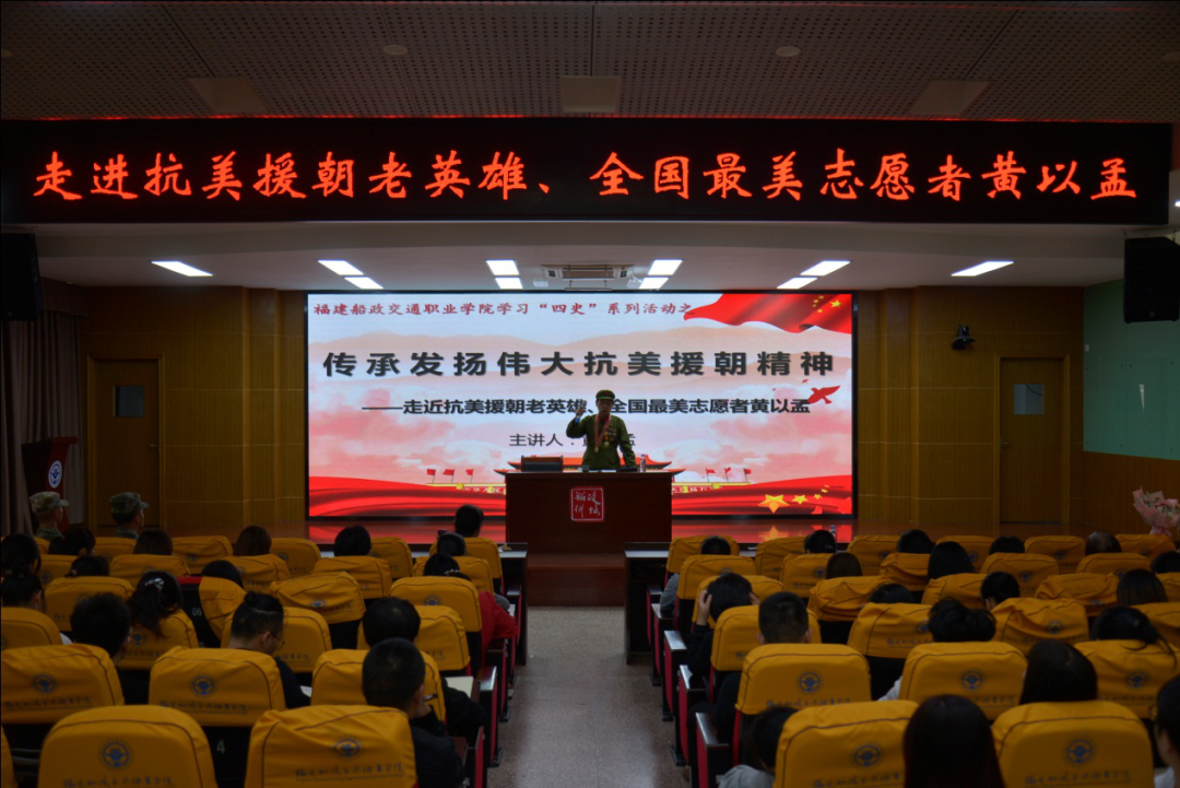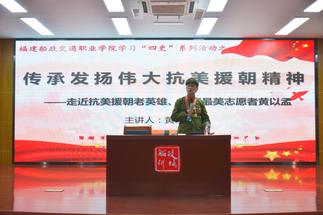 歷史是最好的“教科書”“營養(yǎng)劑”和“清醒劑”。“四史”學(xué)習(xí)教育是引領(lǐng)青年學(xué)生堅定理想信念、矢志拼搏奮斗、砥礪奮進(jìn)社會主義現(xiàn)代化國家建設(shè)新征程的信仰之源和力量之泉。值此抗美援朝戰(zhàn)爭勝利70周年之際,11月3日下午,我校邀請抗美援朝老英雄、全國最美志愿者、89歲高齡的黃以孟老先生蒞臨學(xué)校開展《傳承發(fā)揚(yáng)偉大抗美援朝精神》專題報告會。