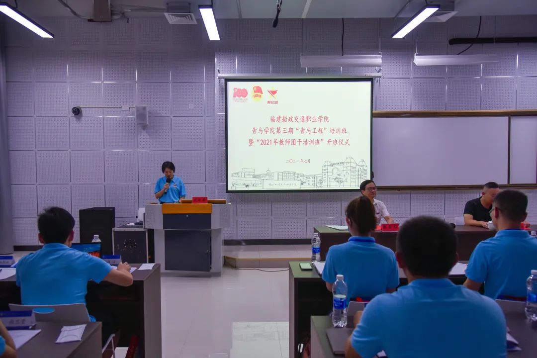 2021年7月8日下午,福建船政交通職業(yè)學(xué)院青馬學(xué)院第三期“青馬工程”培訓(xùn)班暨“2021年教師團(tuán)干培訓(xùn)班”開(kāi)班儀式在武夷新區(qū)職教園舉行。學(xué)院黨委副書(shū)記陳宜大、武夷職教園副主任林峰民及青馬學(xué)院第三期“教師團(tuán)干培訓(xùn)班”全體學(xué)員參加了會(huì)議,會(huì)議由學(xué)院團(tuán)委副書(shū)記梁晶主持。
