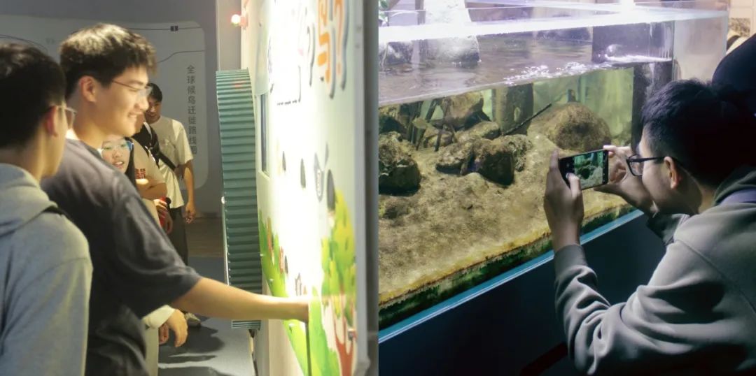 除了科普內(nèi)容外,展廳提供形式多樣的趣味互動(dòng),比如能召喚候鳥(niǎo)的房間,判斷候鳥(niǎo)能否吃哪種食物的轉(zhuǎn)盤(pán),動(dòng)物看世界的體驗(yàn)區(qū)……最有趣當(dāng)數(shù)河流濕地生態(tài)系統(tǒng)、濱海濕地生態(tài)系統(tǒng)。通過(guò)真實(shí)再現(xiàn)濕地水域情況,完全展示凈化原理,社員們對(duì)于濕地生態(tài)系統(tǒng)概念及構(gòu)成、濕地鳥(niǎo)類種類及生存情況、濕地生態(tài)保護(hù)修復(fù)有了新的認(rèn)識(shí),理解濕地在“碳中和”“碳達(dá)峰”建設(shè)過(guò)程中的重要作用。