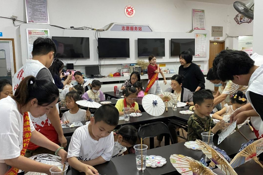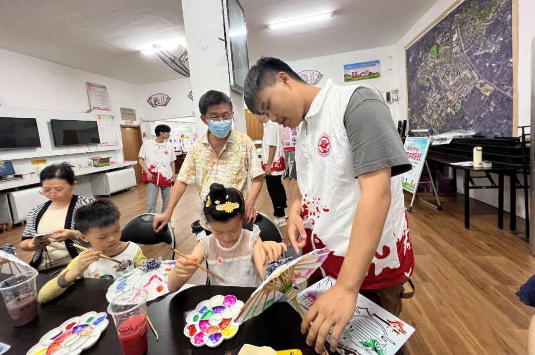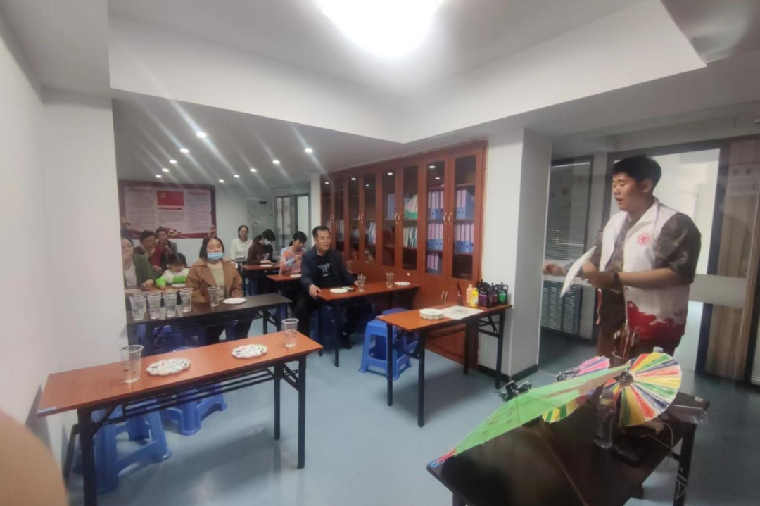 在萬(wàn)里社區(qū),非遺宣講員詳細(xì)地講解了油紙傘的發(fā)展歷史以及油紙傘的制作工藝,讓在場(chǎng)的每一個(gè)人都對(duì)油紙傘都有了更深入的了解。講解結(jié)束后,社團(tuán)成員們給萬(wàn)里社區(qū)的居民們分發(fā)油紙傘,讓他們?cè)谟图垈闵侠L制圖案,體驗(yàn)非遺油紙傘的制作樂(lè)趣。居民們?cè)谝话寻延图垈闵嫌H手繪制的不僅是對(duì)油紙傘的熱愛(ài),更是對(duì)傳統(tǒng)文化的認(rèn)同和傳承。