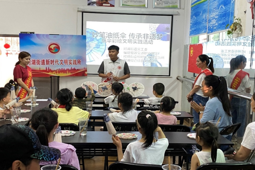 在對(duì)湖街道,社團(tuán)成員們向居民們介紹了有關(guān)福州油紙傘的歷史、文化背景和工藝等方面的知識(shí),并介紹了非遺油紙傘技藝傳承現(xiàn)存的情況。讓更多的人認(rèn)識(shí)非遺油紙傘,熱愛(ài)非遺油紙傘。