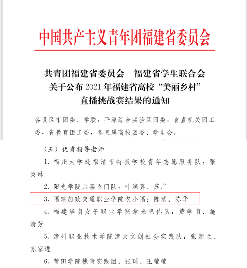 2021年福建省高校“美麗鄉(xiāng)村”直播挑戰(zhàn)賽優(yōu)秀指導(dǎo)老師.