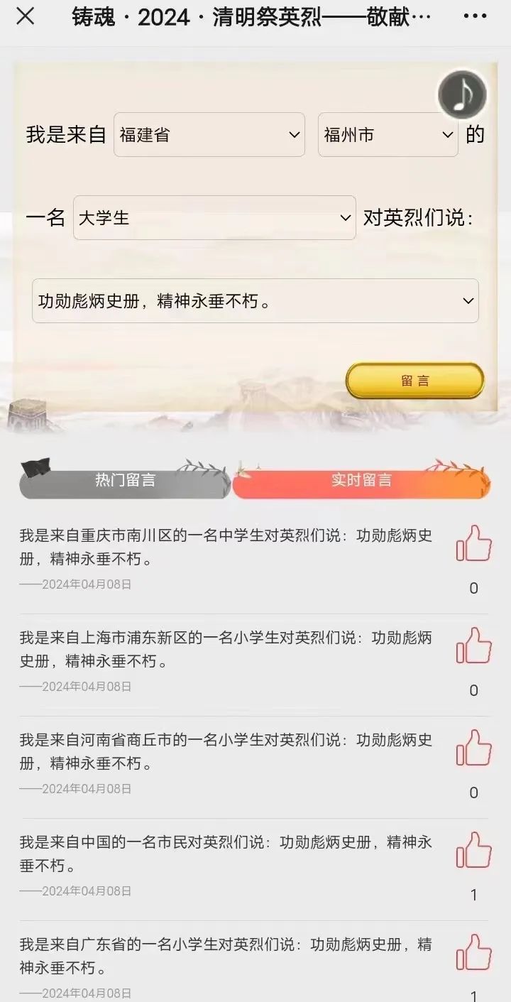 為進一步增進我院廣大學生繼承和弘揚革命英烈的精神,培養(yǎng)大學生愛國意識,經濟與管理學院于2024年4月4日開展“祭奠革命英烈,傳承紅色精神”網絡寄語活動。