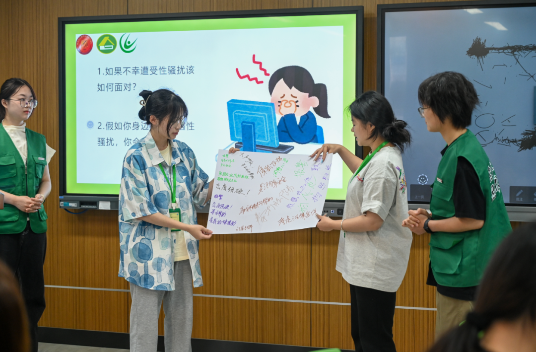 最后,由福建幼兒師范高等專科學(xué)校的青春健康主持人開展以“預(yù)防性騷擾知識科普”為主題的活動分享,通過角色扮演的方式營造相對輕松安全的氛圍,緩解參與者面對性騷擾話題的羞恥、尷尬心理,也清晰界定了性騷擾的形式,隨后通過小組討論的形式告訴參與者遇到性騷擾應(yīng)保持冷靜,明確表達(dá)拒絕,留存證據(jù),尋求他人幫助。