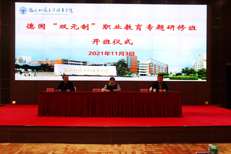 中德職業(yè)教育聯(lián)盟福建省示范基地德國“雙元制”職業(yè)教育專題研修班在我院武夷新區(qū)職教園順利開班,福建省教育國際交流協(xié)會副秘書長張沛玉出席開班儀式,福建船政交通職業(yè)學院對外交流中心主持儀式。來自福建省本科、高職及中職29所學校共100名骨干教師、專業(yè)帶頭人及教學管理人員參加此次研修班學習。