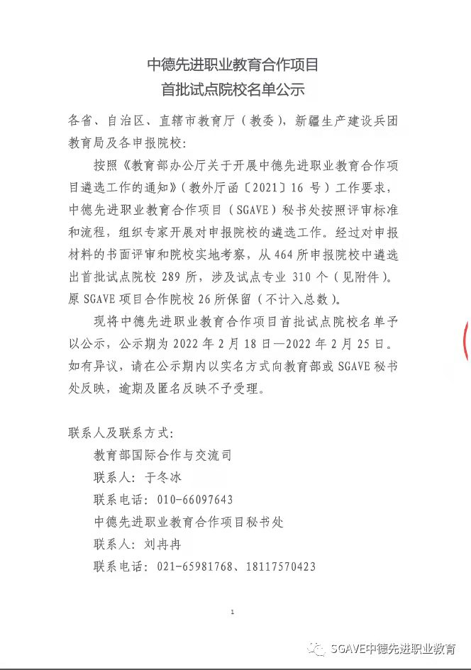 中德先進(jìn)職業(yè)教育合作項(xiàng)目(簡(jiǎn)稱SGAVE項(xiàng)目)是教育部與德國(guó)等歐洲職業(yè)教育模式先進(jìn)國(guó)家行業(yè)龍頭企業(yè)聯(lián)合實(shí)施的職業(yè)教育合作項(xiàng)目。該項(xiàng)目深化產(chǎn)教融合、校企合作,深入推進(jìn)育人方式、辦學(xué)模式、管理體制、保障機(jī)制改革,借鑒“雙元制”辦學(xué)模式,推動(dòng)建設(shè)具有國(guó)際先進(jìn)水平的中國(guó)特色職業(yè)教育體系。