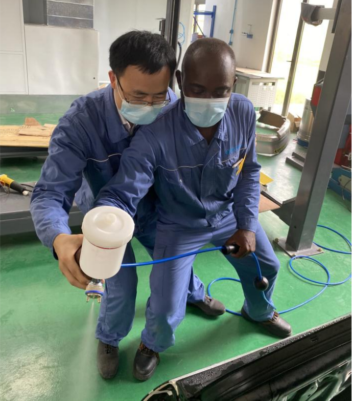 圖2 加蓬團(tuán)隊(duì)手把手教非洲學(xué)員練習(xí)噴漆